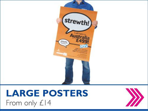 Who said size doesn't matter was clearly talking nonsense. Of course it matters. Our Big Posters from 1+ go all they way from A3, A2, 20x30, A1, 30x40, A0, 40x60 to 2A0, printed on various paper finishes, including 180gsm Matt, 200gsm super glossy paper, 220gsm UV Ink, or matt, gloss laminated poster material, we even print onto foamex, single and double sided printing. We can print permanent stickers, canvas, backlit posters and outdoor signage posters.